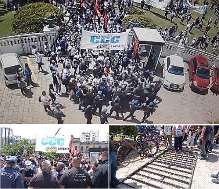 "Con escenas de violencia y forcejeos con los agentes de seguridad de la Municipalidad de La Plata, unas 400 integrantes de organizaciones políticas y sociales vinculadas al peronismo intentaron ingresar por la fuerza y tomar el Palacio Municipal", informaron desde la Municipalidad de La Plata.