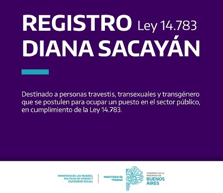 La ministra de Trabajo de la provincia de Buenos Aires, Mara Ruiz Malec y la ministra de las Mujeres, Políticas de Género y Diversidad Sexual, Estela Díaz; en cumplimiento de la Ley 14.783, pusieron en funcionamiento el “Registro Diana Sacayán”, un banco de captación laboral orientado a personas travestis, transexuales y transgénero que se postulen a ocupar un puesto en el sector público de la Provincia de Buenos Aires.
