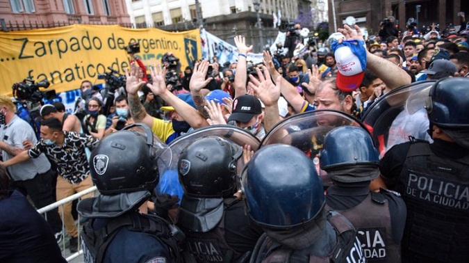 Algunas de las vallas colocadas para contener la marea de gente alrededor de la Plaza de Mayo cedieron ante la presión de los hinchas y cayeron al piso. Las imágenes reflejadas por varios medios de comunicación mostraron algún que otro golpe de los efectivos hacia la muchedumbre en un intento por contener los disturbios. Hubo amontonamientos, gritos e insultos hasta que finalmente la situación se controló y el ingreso al velatorio volvió a la normalidad.