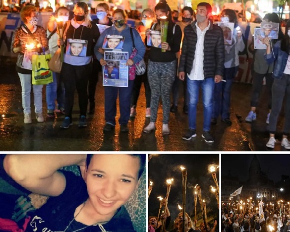 Además, varias antorchas y velas fueron prendidas para reclamar por la aparición con vida de Tehuel, quien fue visto por última vez el 11 de marzo último cuando se dirigió a una entrevista laboral en Alejandro Korn.