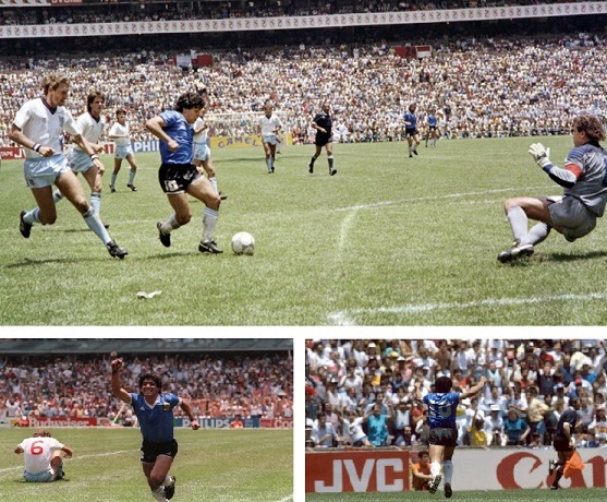 Maradona protagonizó el 22 de junio de 1986 un gol que se inmortalizó como uno de los instantes más gloriosos de la historia del fútbol mundial: en campo argentino, a la altura del circulo central, recibió la pelota, giró para perfilarse hacia el arco e inició un slalom fenomenal en el que dejó en el camino a cuatro rivales más el arquero Peter Shilton para concretar el gol dentro del área inglesa.