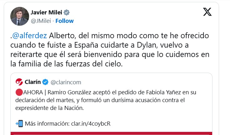 "Alberto, del mismo modo como te he ofrecido cuando te fuiste a España cuidarte a Dylan, vuelvo a reiterarte que él será bienvenido para que lo cuidemos en la familia de las fuerzas del cielo", expresó Milei para invitar a la mascota del ex presidente a vivir en la Quinta de Olivos junto a sus perros.