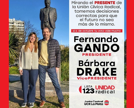 Este domingo 6 de octubre la Unión Civica Radical de la provincia de Buenos Aires celebra elecciones para elegir autoridades provinciales y distritales; la escribana Barbara Drake participa de las mismas como candidata a vicepresidenta de la Junta Central de la UCR La Plata por la lista 123 "Unidad Radical" que lleva a Fernando Gando como candidato a presidente. La dirigente se refirió al estado del radicalismo platense y habló de la propuesta de Unidad Radical para que el partido con candidato propio sea opción de gobierno en las próximas elecciones a intendente.