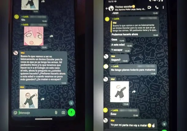 “Bueno, esto es así. Vamos a entrar por la entrada principal como siempre y luego irán dos arriba y dos abajo… acá no es que ustedes elijan a quien mierda le van a disparar, persona que ven, persona que le disparan sin importar el que le toca. ¿Okey? No quiero que se arrepientan a último momento. Si es así créanme que no me gusta gastar mi tiempo. Ya sea estando en la escuela, lo siento mucho, pero los disparos no serán solo para los estudiantes, si no para el que se arrepiente también”, expresa un mensaje en el grupo “Tiroteo escolar” donde hay cerca de 10 alumnos.