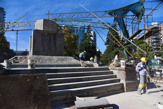 Además, se avanza en la restauración de las columnas ornamentales, el movimiento de suelos, la construcción de contrapisos de hormigón, la colocación de mosaicos en los senderos y la terminación de los espacios de estar y descanso, donde luego se reubicarán los bancos y se incorporará mobiliario.