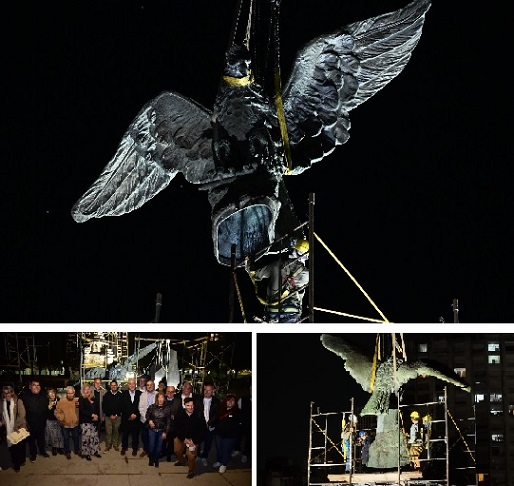 Las tareas siguieron con la nivelación del terreno, la colocación de los tres cilindros del fuste, el capitel que lo remata y las tres columnas que sostienen el águila, el hormigonado de todo el sector y el montaje del águila por encima, luego de ser limpiada y protegida, con la participación de decenas de operarios y el empleo de una grúa de gran porte.