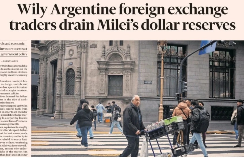 «El fracaso de Milei en acumular reservas ha inquietado a los inversores en las últimas semanas e impulsado una liquidación de activos argentinos. La agitación del mercado comenzó el mes pasado cuando una mala derrota en las elecciones locales generó dudas sobre el apoyo a las reformas de Milei, lo que provocó la caída en picado de los precios de los bonos y del peso», señaló el artículo.