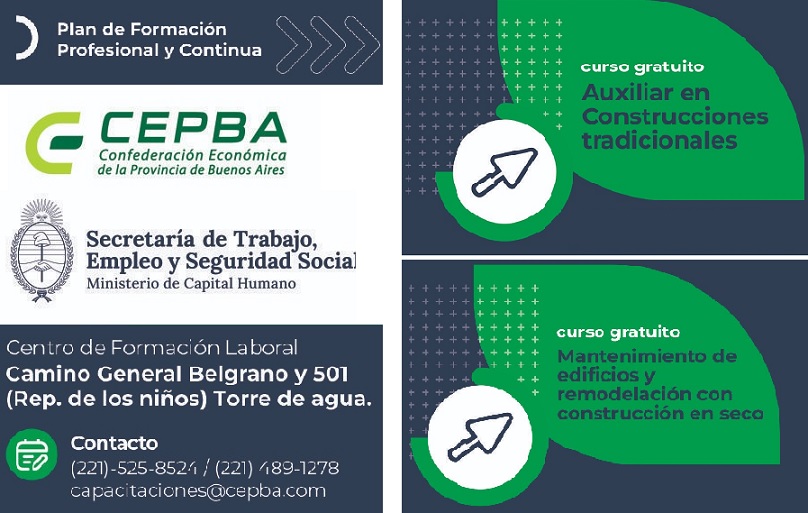 Comenzarán el 10 de marzo y se darán en el Centro de Formación Laboral de la República de los Niños (Torre de agua) sito en camino General Belgrano y 501. La inscripción esta abierta y las personas interesadas deberán comunicarse a los teléfonos 221 158524 / 221 4891278 o al mail: capacitaciones@cepba.com.