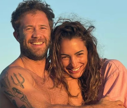 La pareja posó sobre los cimientos de su terreno en Chapadmalal.