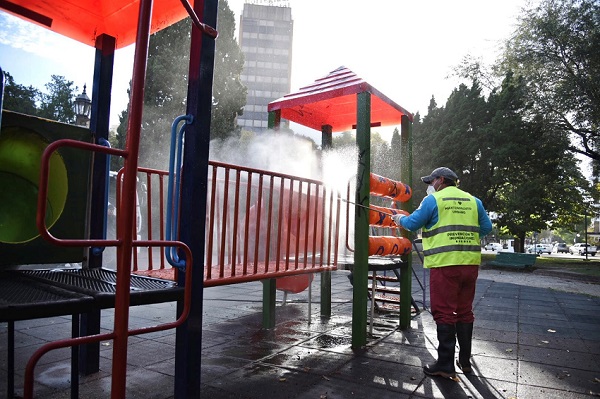 En el marco del plan de prevención contra el COVID, la Municipalidad de La Plata lleva adelante tareas de hidrolavado y desinfección en parques y plazas de la ciudad.