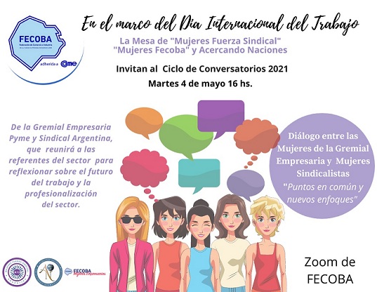 Será este martes 4 de mayo a las 16 horas a través del Zoom de FECOBA, con motivo del Día Internacional del Trabajo y es organizado por la Mesa de "Mujeres Fuerza Sindical", "Mujeres Fecoba" y Acercando Naciones.