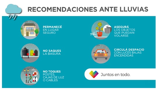 Desde el área de Hidrometeorología se precisó que “las precipitaciones están previstas que comiencen a partir de las 16 horas en forma de chaparrones". Por ese motivo, la comuna sostiene guardias preventivas. Piden a los vecinos que se informen a través de los canales oficiales de comunicación.