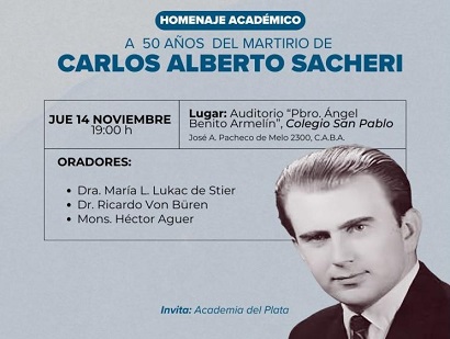La Academia del Plata invita al acto académico en homenaje al filósofo argentino, a realizarse el jueves 14 de noviembre en el auditorio del Colegio San Pablo de CABA. Sacheri era doctor en filosofía, católico praticante y su mentor habia sido el padre Meinvielle.