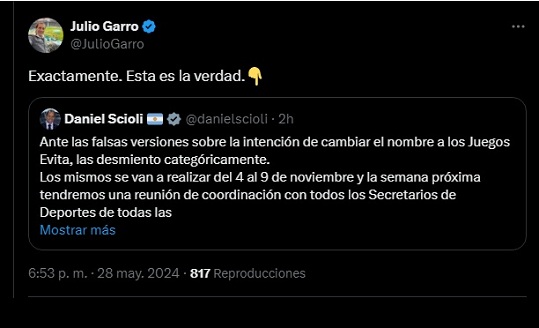 Scioli y Garro desmintieron que se les cambió el nombre a los "Juegos Evita": "Todo es totalmente FALSO"