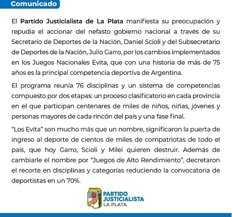 El PJ La Plata calificó de "nefastos" a Scioli y Garro por querer destruir los "Juegos Evita" junto a Milei