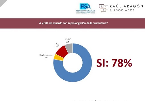 Sobre la extensión de la cuarentena, el 78% respondió que está de acuerdo mientras que el 10,5 &% dijo que no. Pero al referirse a cómo será la economía del país después de la cuarentena, el 67,6% dijo que mala, el 22,4% muy mala y el 1,9% buena. Sobre la economía personal, el 30,4% muy mala y el 41,4 % consideró mala y un 23,4% aún no sabe.