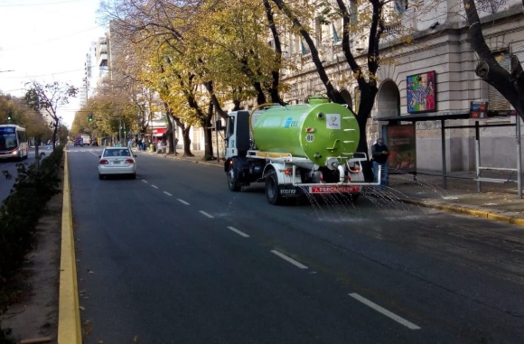Con una flota de camiones hidrantes especialmente preparados para rociar una solución de agua y cloro supervisada y avalada por los profesionales de la Salud del SAME, la Comuna continúa desarrollando tareas de desinfección en los distintos puntos de la ciudad a los fines de profundizar las medidas de limpieza e higiene para evitar la propagación del COVID-19.