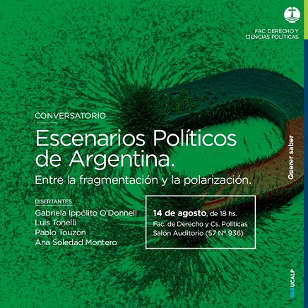 Este miércoles 14 de agosto, a las 18 en el Auditorio de la Facultad de Derecho y Ciencias Políticas de la Universidad Católica de La Plata, calle 57 N° 936 (13 y 14) La Plata; en el marco de la carrera de de Ciencias Políticas y Relaciones Internacionales se realizará un evento de análisis post PASO bajo el interesante nombre de : Conversatorio "Escenarios Políticos de Argentina - Entre la fragmentación y la polarización"