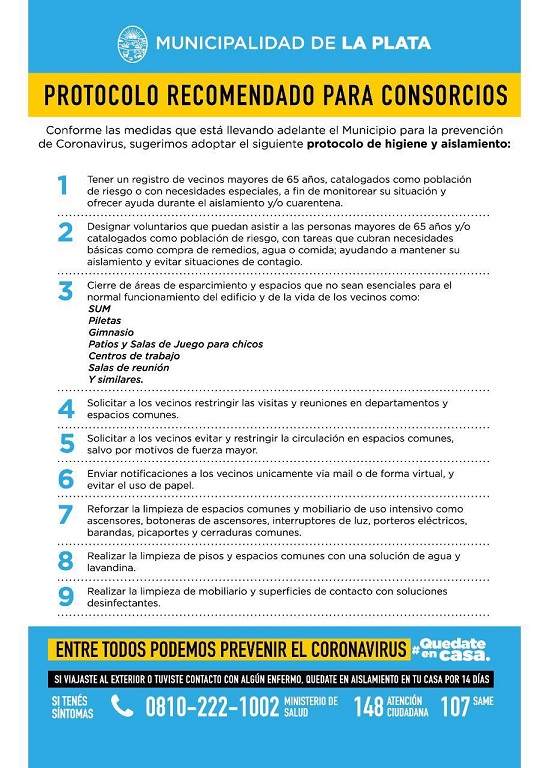 La secretaría de Salud de la comuna dio a conocer una serie de consejos para los consorcios de edificios de la ciudad. En ese sentido, se hace hincapié en la colaboración con los adultos mayores, llevar adelante medidas de higiene en ascensores, botoneras, porteros eléctricos, barandas y picaportes, entre otros. Asimismo se insta a cerrar todos los espacios de uso comunes como SUM, salas de trabajo, piletas y gimnasios.